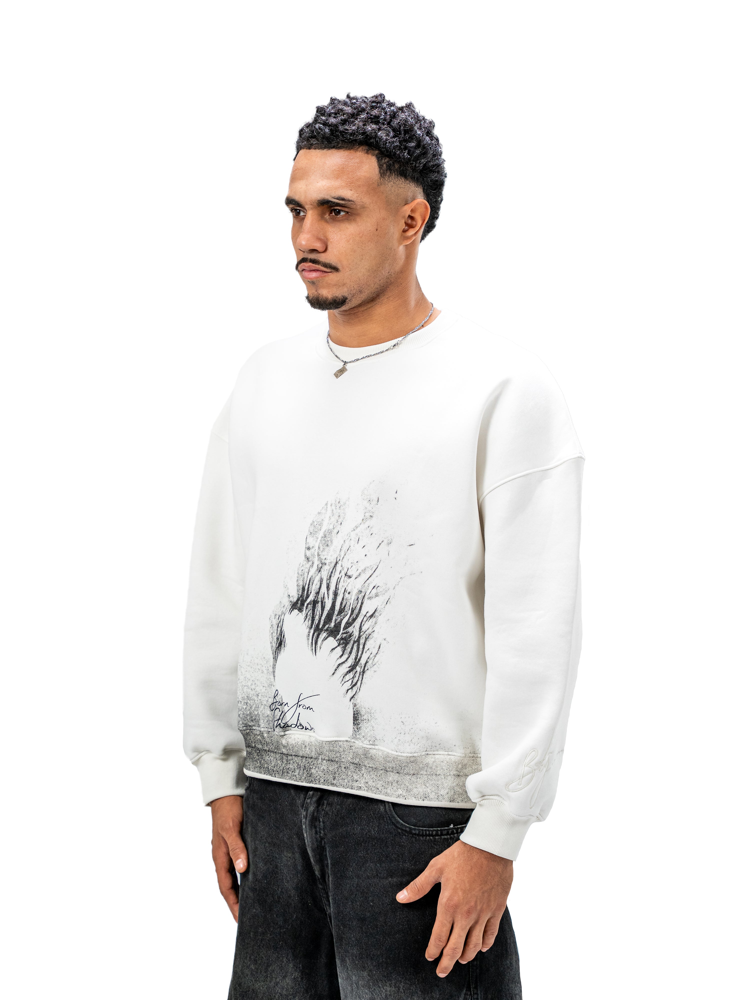 The Born From Shadows Crewneck features a powerful monochrome artwork printed across the front, blending a soft gradient effect with expressive hand-drawn styling. Made from premium cotton Milton fabric, it offers warmth, comfort, and a smooth feel for everyday wear. The boxy fit creates a relaxed modern silhouette, making it perfect for streetwear layering. Finished with high-quality silk-screen printing to preserve the fine details and depth of the design.