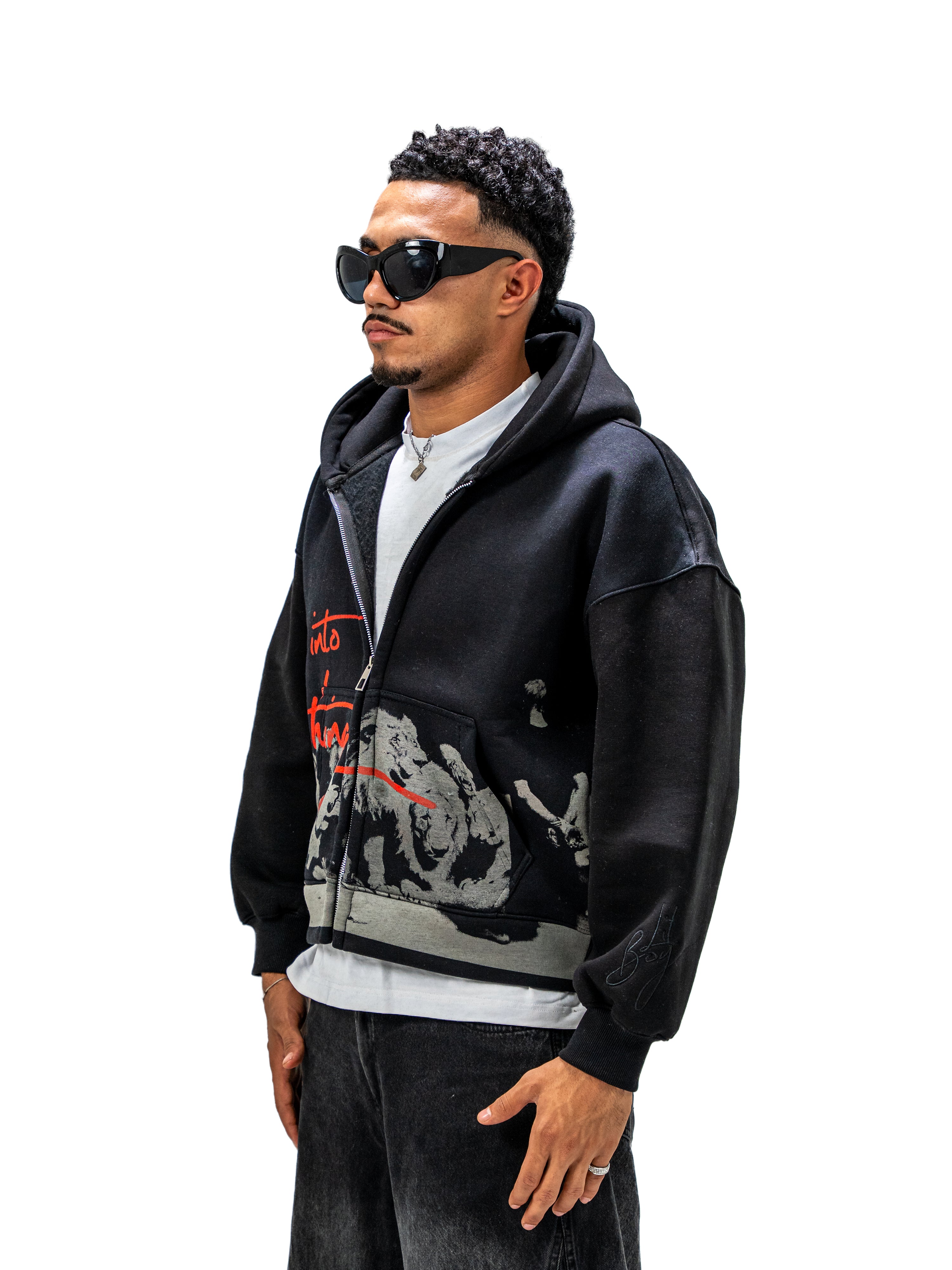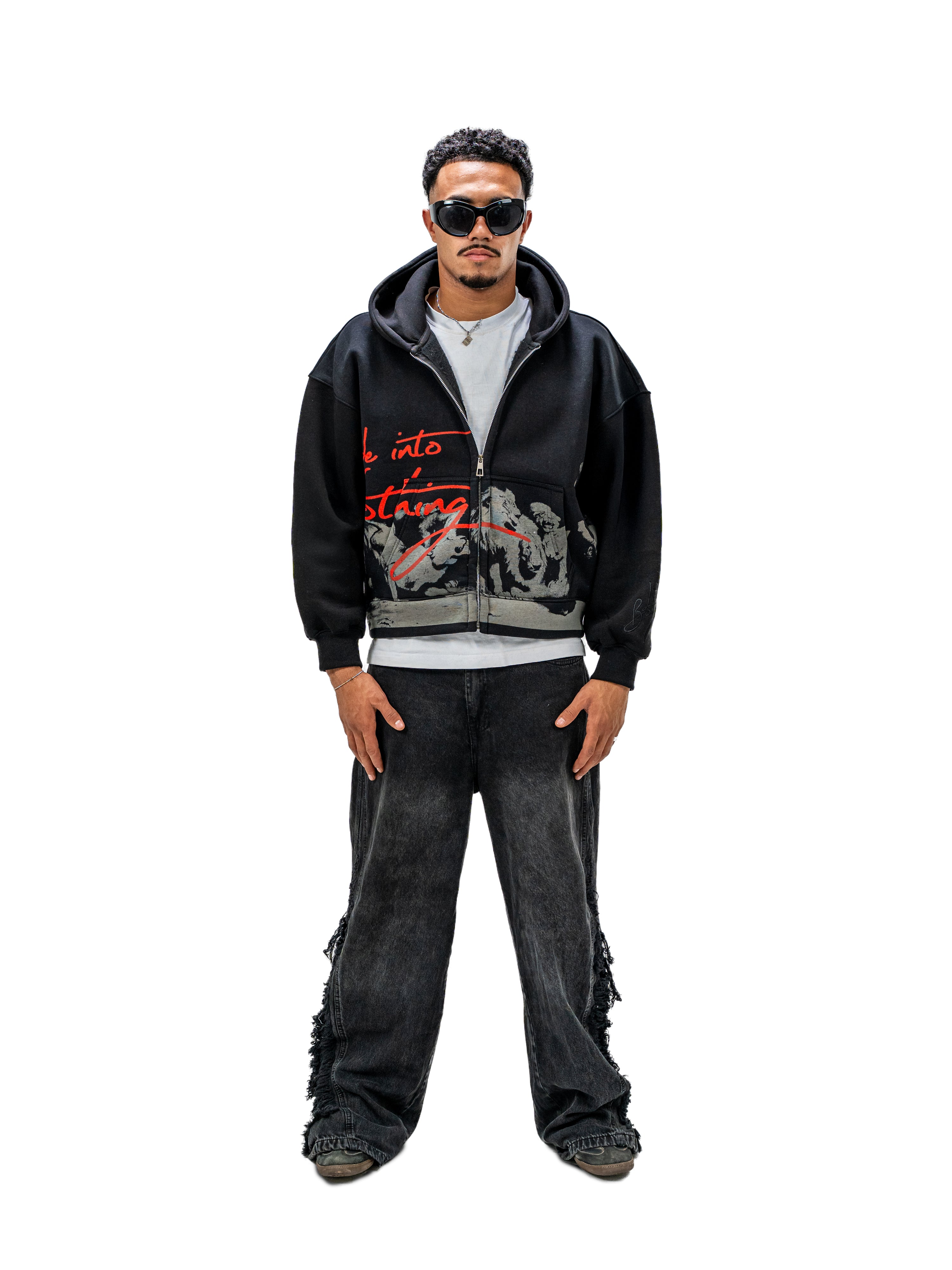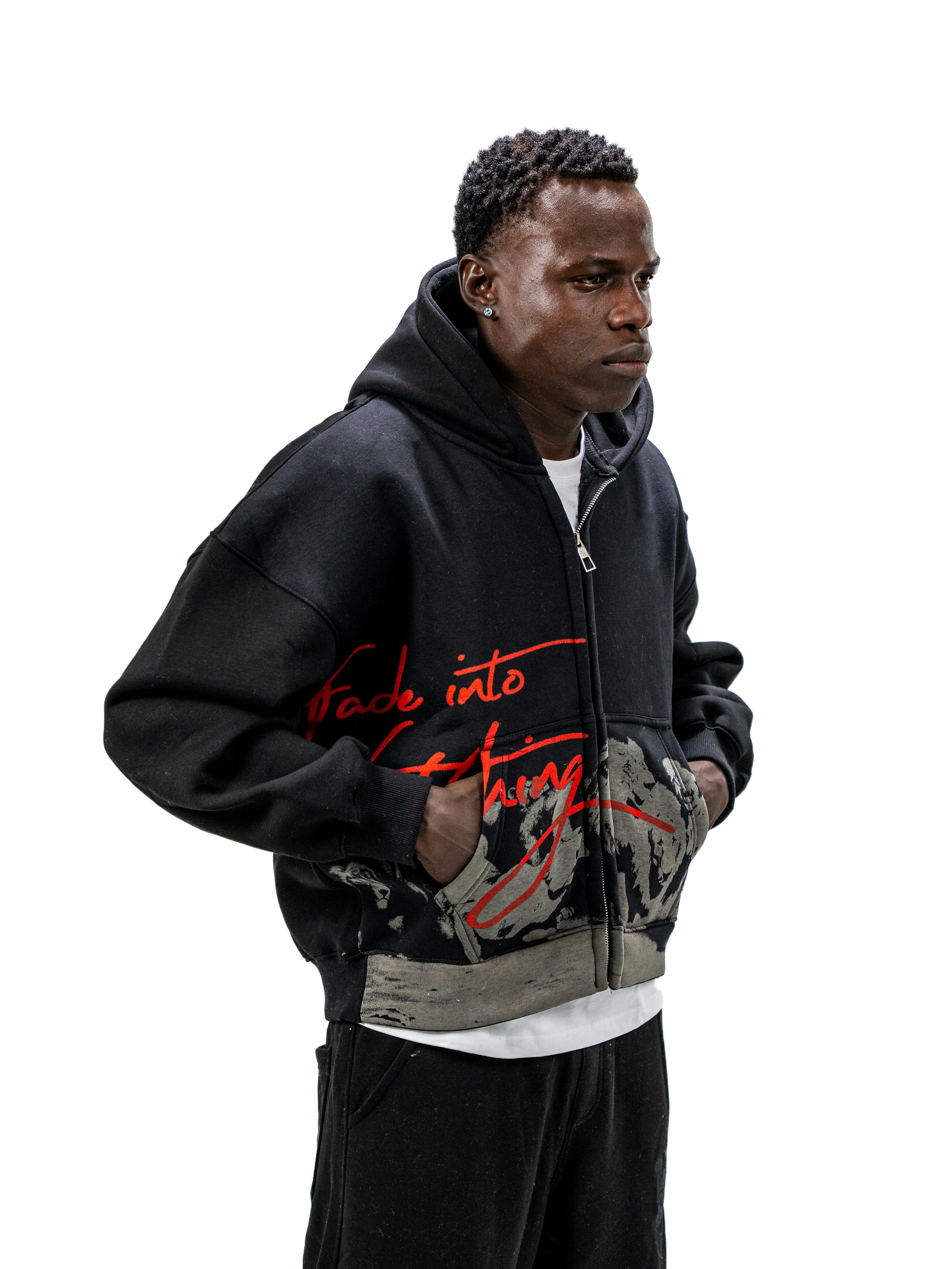 The Fade Into Nothing Full Zip Jacket features a bold artistic design that blends a monochrome illustration with striking red typography for a dramatic streetwear aesthetic. Made from premium cotton Milton fabric, it delivers everyday comfort and warmth. The full zip closure and hood create a practical, modern silhouette, while the silk-screen print ensures long-lasting detail and durability. A standout piece that adds an expressive artistic touch to any casual outfit.