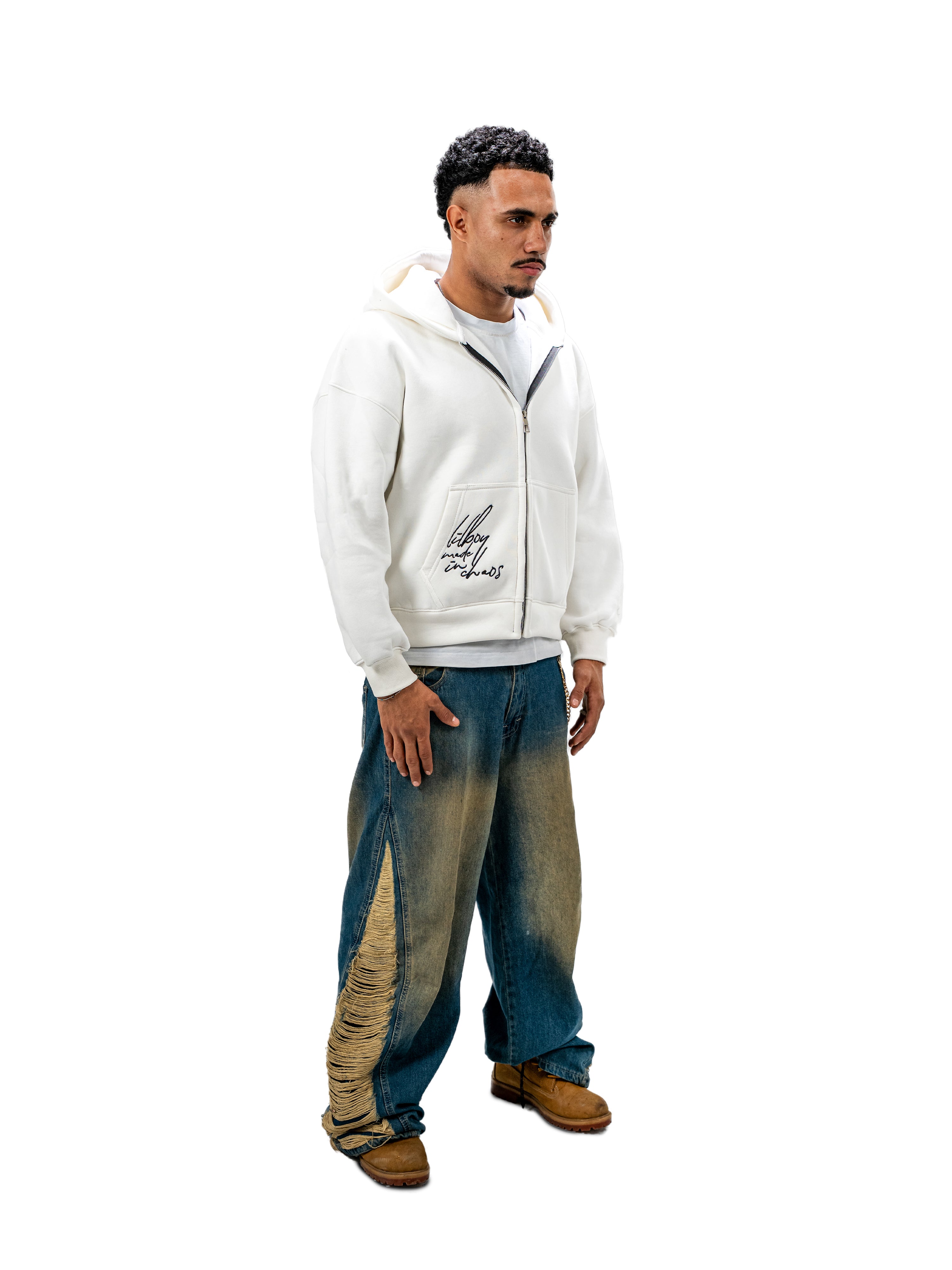The Made in Chaos Full Zip Jacket features a clean off white base with a subtle handwritten-style graphic on the front, giving it a minimal yet expressive streetwear aesthetic. Made from premium cotton Milton fabric, it offers warmth, softness, and long-lasting comfort. The boxy fit adds a modern oversized silhouette, while the full zip closure ensures easy everyday wear. Finished with high-quality silk-screen printing to preserve the fine details and artistic feel of the design.